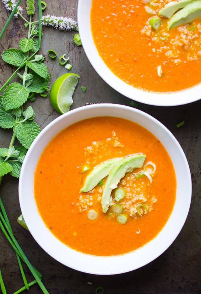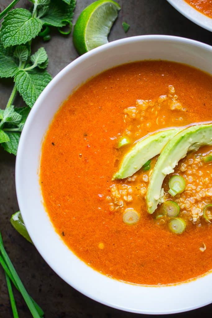 - The quinoa, avocado and scallions are added to the soup and give it a good dose of protein, texture and healthy fats. A squirt of lime juice adds a bright, citrusy kick to top it all off!